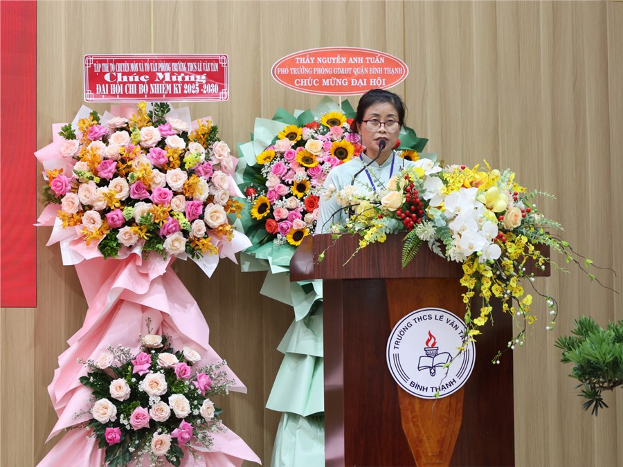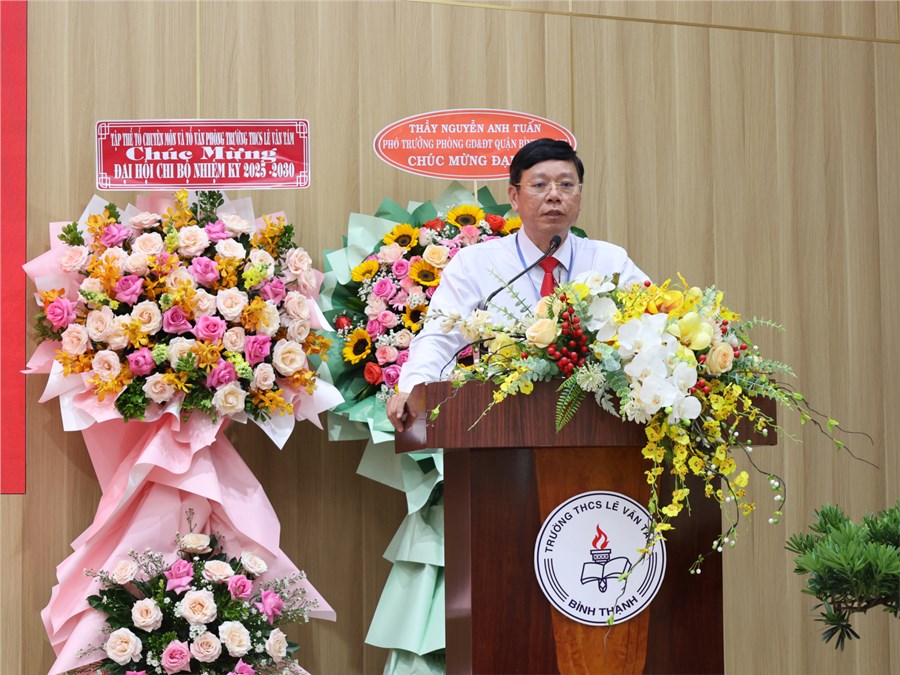 Phát biểu tại Đại hội, đồng chí Vũ Ngọc Tuất - Bí thư Quận ủy đã ghi nhận, đánh giá cao kết quả Đảng bộ trường THCS Lê Văn Tám đạt được trong nhiệm kỳ qua; đồng thời cũng thẳng thắn chỉ ra những mặt còn thiếu sót và nhấn mạnh trong thời gian tới, nhà Trường cần có giải pháp nâng cao chất lượng giáo dục để luôn xứng đáng là lá cờ đầu trong phong trào giáo dục của Quận nhà, phấn đấu chất lượng giáo dục đứng trong tốp đầu của thành phố; tiếp tục thực hiện tốt quy chế dân chủ trong nhà trường, thực hiện tốt công tác giáo dục chính trị tư tưởng, đảng bộ phán đấu đạt Trong Sạch Vững Mạnh.