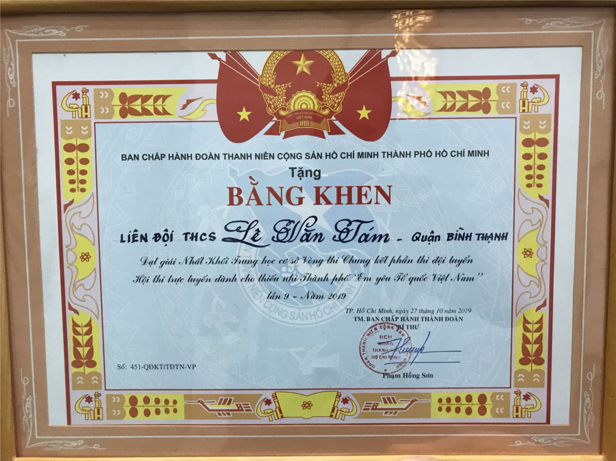Hội thi trực tuyến dành cho thiếu nhi “Em yêu Tổ quốc Việt Nam” lần 7 – năm 2019 do Hội đồng Đội Thành phố phối hợp cùng Báo Quàng đỏ tổ chức hưởng ứng đợt hoạt động kỷ niệm 90 năm ngày thành lập Đảng Cộng sản Việt Nam (03/02/1930 – 03/02/2020) đã thu hút được 100% Liên đội trên địa bàn thành phố với số lượt thi là 946.664, đặc biệt Liên đội Trường THCS Lê Văn Tám chúng mình đã xuất sắc vượt qua 19 đại diện từ 19 quận, huyện để góp mặt trong Top 5 bảng THCS tiến vào vòng chung kết hội thi vừa tổ chức vào ngày chủ nhật vừa qua 27/12/2019. Đó quả là một ngày đáng nhớ với đội thi chúng mình.